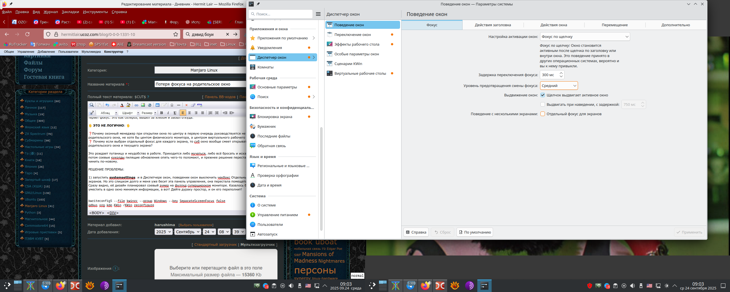 После какого-то обновления у меня опять слетели настройки окон. Я не понимаю, зачем так делается специально или это такой ху█к-х█як и в продакшн. Открываю в файлменеджере окно, закрываю его, и фокус на родительское теряется. И атк со всеми программами, умеющими открывать субокна. Согласитесь не очень удобно. А всё потому, что KDE кладёт х█й на двухмониторные системы. У меня два монитора. Ещё бесит, что приложения почему-то открывают свои субокна не в пределах родительского, а например на другом мониторе или посередине, а потом теряет фокус. Это как склероз, вышел за хлебом и забыл откуда.